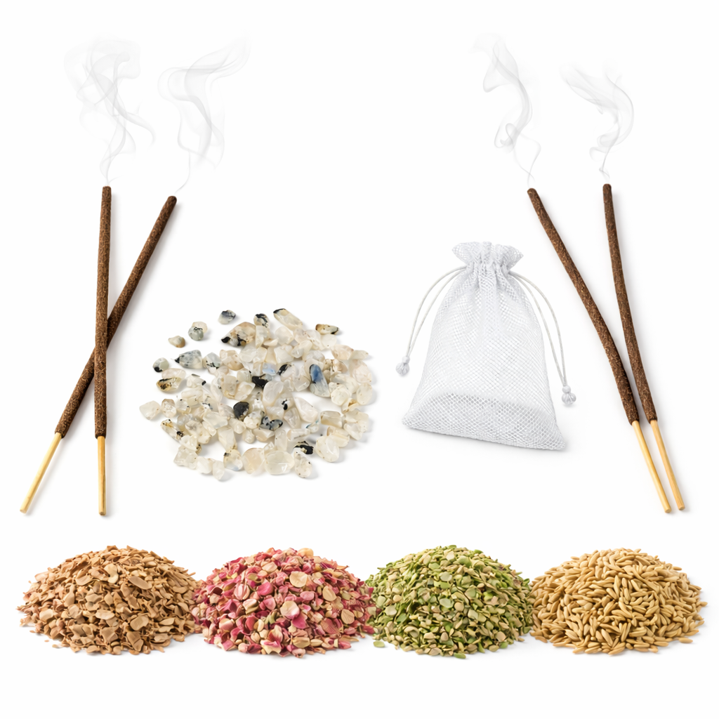 Each kit includes 7 tea bags, approx 25g of moonstone, 2 jasmine and 2 vanilla incense sicks.